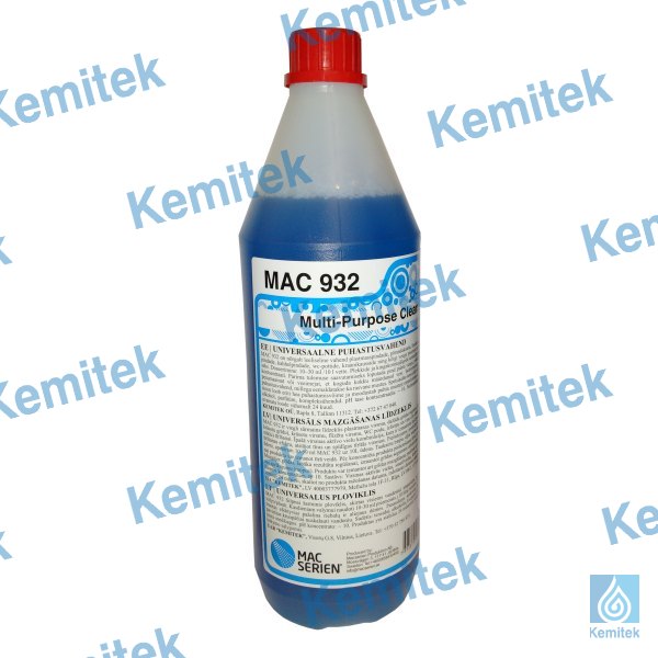 121932MAC 932 ir viegli sārmains, līdzeklis plastmasas virsmu, dažādu grīdas segumu (linoleja, akmens, flīzētu un krāsotu grīdu), krāsotu virsmu, flīzētu virsmu, WC podu, izlietņu un visu citu ūdens izturīgu virsmu (izņemot stiklu) tīrīšanai. Īpašā virsmas aktīvo vielu kombinācija, kura ir izmantota šajā produktā nodrošina īpaši labu tīrīšanas efektu, atstājot tīras un spīdīgas tīrītās virsmas. Pielietojums: produkts ir jālieto atšķaidītā veidā ar ūdeni, apmēram 10-30ml uz 10 litriem ūdens. Taukainu traipu, eļļas traipu un apavu atstāto švīku tīrīšanai produktu var izmantot tīrā veidā. Pēc koncentrēta produkta pielietošanas tīrīto virsmu noskalot ar tīru ūdeni. Mazgājot grīdas, labāka rezultāta iegūšanai, izmantot grīdas segumam atbilstošas kvalitātes grīdas mazgāšanas aprīkojumu (mopus).